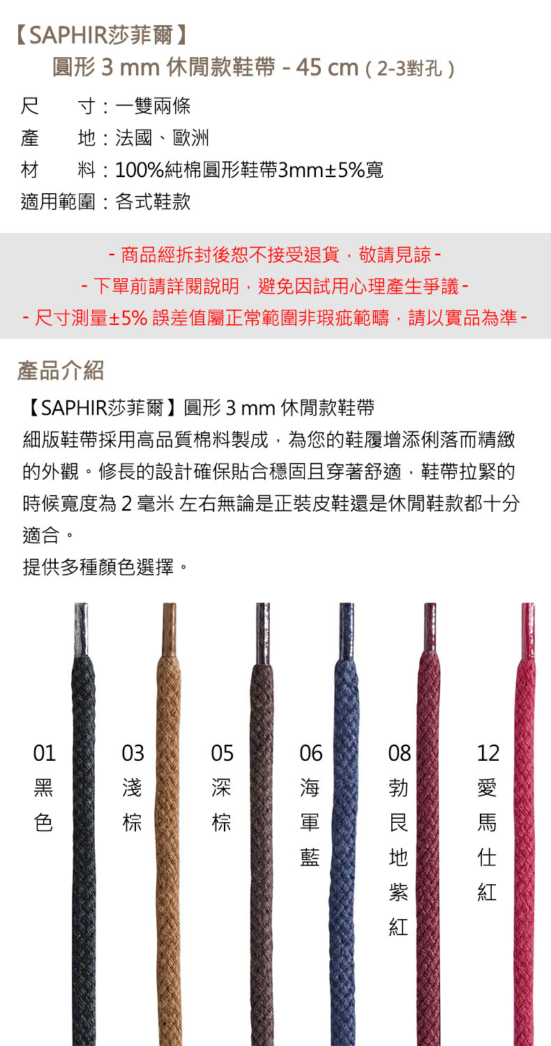 圓形3mm休閒款鞋帶-45cm(2-3對孔)