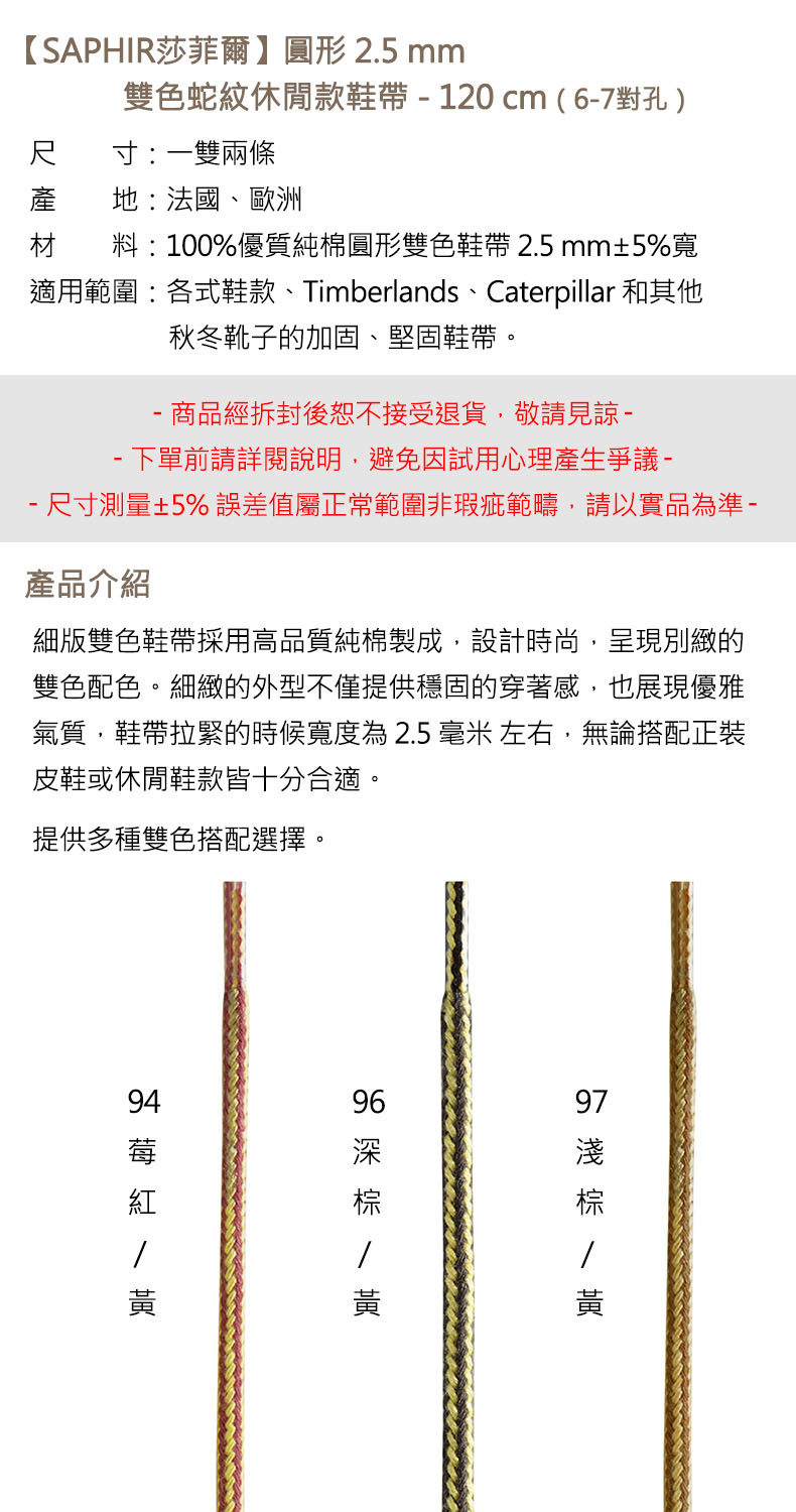 圓形2.5mm雙色蛇紋休閒款鞋帶-120cm(6-7對孔)