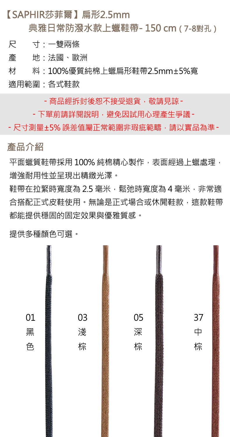 扁形2.5mm典雅日常防潑水款上蠟鞋帶-150cm(7-8對孔)