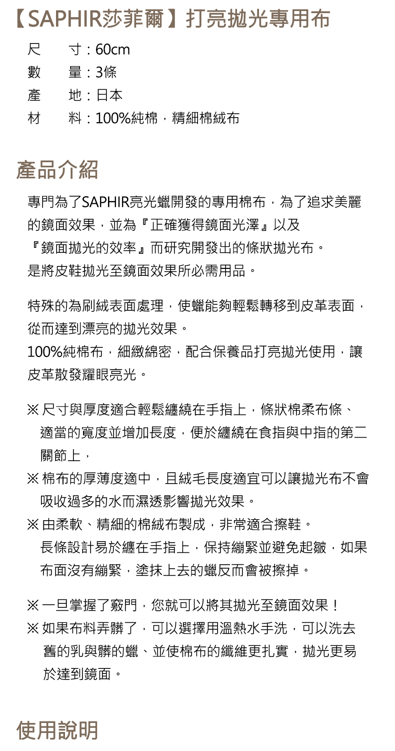 100%純棉布,細緻綿密,配合保養品打亮拋光使用,讓皮革散發耀眼亮光